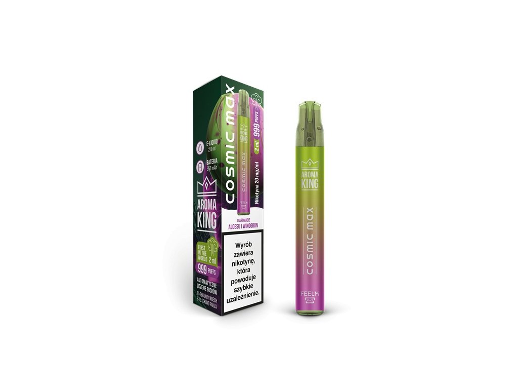 Jednorázová e-cigareta Aroma King Cosmic Max 999 kombinuje svěžest aloe vera s bohatou sladkostí hroznů, což vytváří nezapomenutelný zážitek.