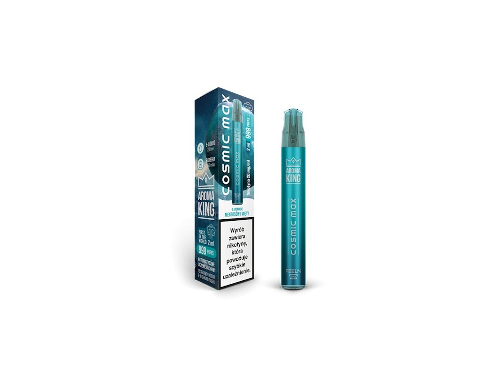 Jednorázová e-cigareta Aroma King Cosmic Max 999 Mentos Mint přináší chladivé osvěžení mentolu a čerstvé máty, které vás jemně zaštípe na rtech.