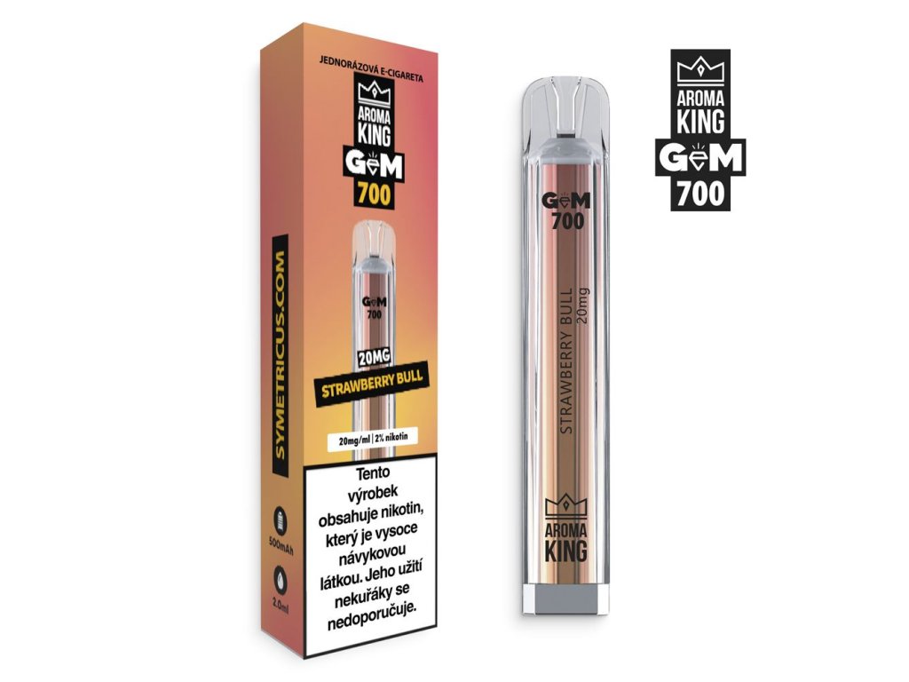 Jednorázová e-cigareta Aroma King Gem Bar 700 Strawberry Bull se známou příchutí energy drinku, který je příjemně oslazen jahodou.