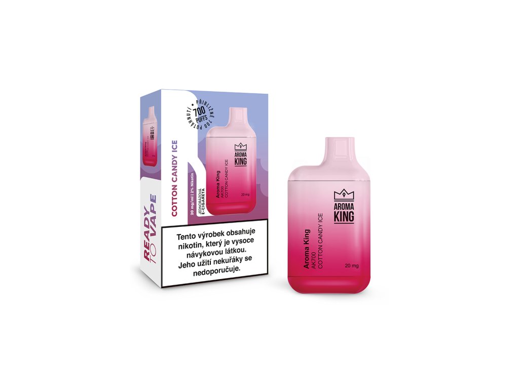 Jednorázová e-cigareta Aroma King Mini 700 Cotton Candy Ice. Každý potah přináší autentickou chuť oblíbené dobroty ze stánků. Ledová složka zjemňuje sladkost cukrové vaty a poskytuje uživatelům chladivý a osvěžující zážitek.