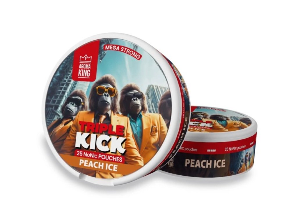 Aroma King TRIPLE KICK - PEACH ICE jsou NoNicotinové sáčky se svěží, krémovou a příjemně sladkou chutí broskve s přidaným mentolem pro silnější pocit pálivosti. Sáčky NoNic jsou určeny pro pokročilé a zkušené uživatele - 20mg NoNic substance má sílu jako 100mg nikotinu.